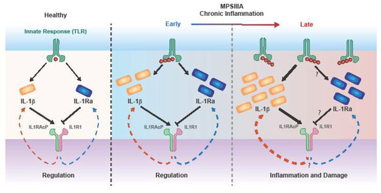 IL-1 is known to be implicated in a variety of functions which include: IL-2 and IL-6 production, enhancement of inflammatory reactions and development of neurodegenerative disorders [87]. Notably, both IL1α and IL1β can bind to the IL1 receptor (IL1R) family, which include: IL1R1, IL1R2 and IL1R3 [93]. While the binding of IL1R1 leads to the activation of the NF-kB, MAPK, p38 and JNK signalling pathways [87], IL1R2 acts as a decoy receptor, eventually inhibiting the activity of its ligands [94]. Conversely, IL1R3 has been proven to act as a coreceptor, by forming a trimeric complex with IL1 and IL1R1 [93]. IL1 activity is modulated by the IL-1 receptor antagonist (IL1-Ra), which competes for the IL1R1 binding site, eventually blocking IL-1-mediated cellular changes [95]. The balance between IL1 and IL1Ra has been proved to be crucial to maintain normal physiological conditions. In this regard, upon injection of LPS into healthy individuals, a first IL-1 peak was observed after 2 h, followed by an IL1-Ra peak between 3 to 6 h marked by 80-fold levels over IL-1 [96]. In fact, because of the spare receptor effect, very high levels of IL1Ra are required to achieve complete inhibition of IL-1 activity. Both IL1 and IL1RA are elevated in MPSIIIA (patients and mouse models) as well as several other MPS diseases and chronic inflammation appears to negatively impair the negative feedback loop (Figure 1).