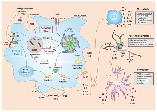 We propose that the progressive accumulation of abnormal GAGs triggers an inflammatory response in MPSs, which is initiated by TLR4 activation (Figure 2). Altered highly sulphated GAG fragments are recognized as DAMPs, eventually triggering several signalling cascades which result in the activation of macrophages and microglia. The latter, in turn, releases a number of pro-inflammatory cytokines, such as TNF-α and IL-1, which induce progression through chronic neuroinflammation. While TNF-α is mostly associated with bone and joint disease in MPSs, IL-1 seems to be more involved in CNS inflammation. In this regard, our extensive review of disease pathology seems to suggest TLR4/IL1-signaling-depedent priming, and secondary storage material-mediated amplification of neuroinflammation. In fact, the priming results in the activation of the NF-Kβ pathway, which could also subsequently prime the NLRP3 inflammasome assembly. Simultaneously, the progressive accumulation of primary and secondary substrates within the lysosome could eventually hamper a multitude of key functions, ultimately contributing to the full activation of the inflammasome (Figure 2). Once activated, the latter induces IL-1β and IL-18 maturation and pyroptosis. Despite the presence of anti-inflammatory factors, such as IL10, IL1Ra, seen in many chronic conditions, we hypothesise that the negative feedback loop of IL1beta/IL1Ra is compromised by continuous production of proinflammatory cytokines. In all, not only is there significant evidence suggesting the involvement of the NLRP3 inflammasome in the chronic neuroinflammation observed in MPS diseases, but we propose IL-1 as a main effector of the pathological effects of innate immunity in the neuropathological MPSs, including manifestation of altered behaviours.