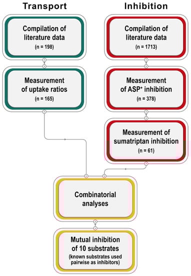 We present a large database on inhibition and transport by OCT1, and subsequent experiments explaining their relationship (Figure 1). First, we extended the OCT1 substrate database using a unified parameter for measuring transport, the ratio of uptake in overexpressing cells over uptake in mock-transfected cells. Second, we extended the list of OCT1 inhibitors using the standard model substrate ASP+ and, in addition, sumatriptan, one of the most specific and clinically relevant OCT1 substrates. We added new in vitro data where no in vitro data with comparable methodology was available. Third, based on the inhibition and transport data, we analyzed the relationship between both. In addition, we analyzed mutual inhibition between 10 characteristic substrates of OCT1. Excitingly, these analyses revealed compound pairs with enhanced transport as well as pairs showing no inhibition, so that, fourth, we analyzed those pairs in more detail using a wide range of concentrations. As underlined by our final experiments, uptake enhancement may be explained by inhibition of substrate efflux after successful uptake.