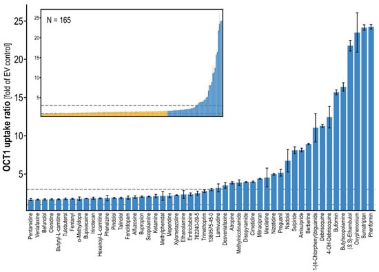 Substrate uptake ratios in OCT1 overexpressing cells over empty vector cells at 2.5 µM. Error bars indicate standard error of the mean between replicates. The large plot shows the top 50 substrates, the miniature plot shows the overview of all 165 tested compounds. The upper dashed line indicates the uptake ratio of 3, considered by the authors as a reasonable cutoff for relevant transport.