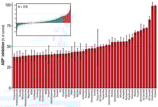 Percentage inhibition of OCT1-mediated ASP+ transport by various compounds. Authors’ own, unpublished data. Error bars indicate standard error of the mean between replicates. The large plot shows the top 50 inhibitors, the miniature plot shows the overview of all 378 tested compounds.