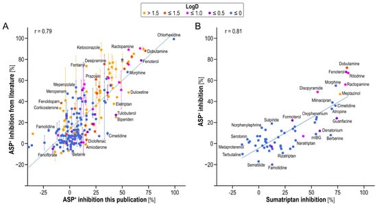(A) Comparison of OCT1 inhibition as measured by reduction in ASP+ uptake in the present study with measurements published earlier [,]. (B) Comparison of OCT1 inhibition as measured by reduction in sumatriptan uptake with the respective inhibition measured with ASP+. Dots indicate the means, vertical lines the range between laboratories. Dot color is indicating logD of the respective compounds at pH 7.4. Only selected substances are labelled, a complete listing of all our data is given in Table S1.