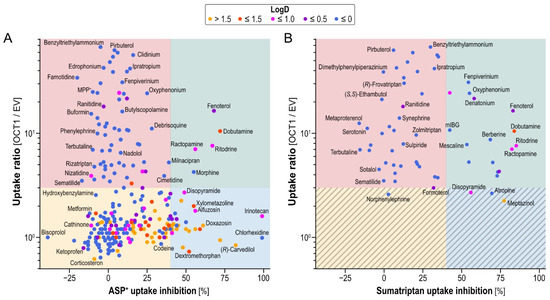 OCT1 uptake ratio (means of new and previously published data) versus inhibition data. (A) Inhibition data using model substrate ASP+. (B) Inhibition data using model substrate sumatriptan. Dot color indicates logD of the respective compounds at pH 7.4. Colored quadrants indicate non-inhibiting substrates (red), inhibiting substrates (green), inhibiting non-substrates (blue) and non-inhibiting non-substrates (yellow). Most substrates with an uptake ratio < 3 have not been tested with sumatriptan as indicated by the hatched areas in (B).