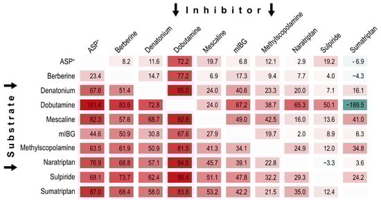 Mutual inhibition of ten selected OCT1-substrates. Data provided as percentage inhibition compared to uptake into non-inhibited OCT1 overexpressing and EV-transfected cells. Cell colors corresponding to degree of inhibition. It may be noted that negative inhibition corresponds to stimulation of transport (sumatriptan effect on dobutamine) while inhibition of more than 100% (ASP+ effect on dobutamine) might correspond to ASP+-mediated stimulation of dobutamine efflux.