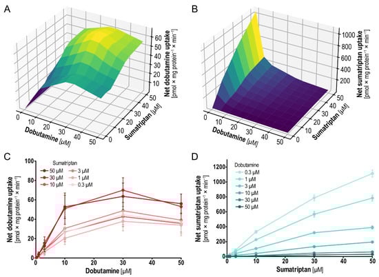 Concentration-dependent mutual inhibition of dobutamine and sumatriptan uptake. (A) Three-dimensional plot showing means of intracellular dobutamine concentration of three independent experiments and interpolations. (B) Three-dimensional plot showing means of intracellular sumatriptan concentration of three independent experiments. (C,D) Two-dimensional projections of (A,B) including means and SEM of three independent experiments.