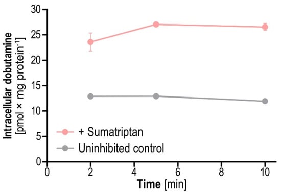 To follow up on the potential mechanisms behind the observed enhanced transport of dobutamine uptake by sumatriptan, we investigated sumatriptan-mediated inhibition of dobutamine efflux from preloaded cells. Results showed that 2, 5 and 10 min after addition of sumatriptan, efflux of preloaded dobutamine was reduced (Figure 8). Remaining intracellular dobutamine was increased by 2.0-, 2.1 and 2.5-fold compared to the non-inhibited control when sumatriptan was added to the extracellular buffer during the efflux period. This hints at OCT1-mediated efflux of dobutamine, inhibitable by sumatriptan, as one possible mechanism for enhanced intracellular accumulation.