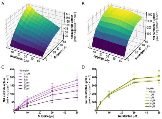 With the second pair that showed interesting results in the mutual inhibition testing, sulpiride and naratriptan, a picture different from that for dobutamine and sumatriptan emerged (Figure 9). Sulpiride uptake was increasingly inhibited with increasing concentrations of naratriptan (Figure 9A,C). On the other side and more surprising, naratriptan uptake was constant, irrespective of the presence of sulpiride at varying concentrations (Figure 9B,D).