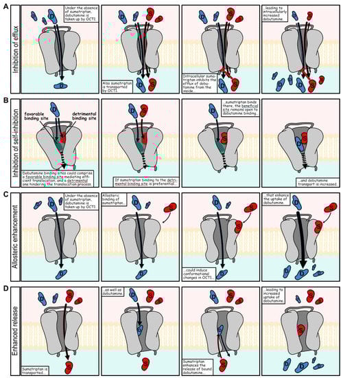 Potential mechanisms leading to increased intracellular dobutamine concentrations. Among them are (A) inhibition of dobutamine efflux by intracellular sumatriptan, (B) inhibition of dobutamine-self-inhibition by sumatriptan from the extracellular side, (C) allosteric enhancement, and (D) enhanced dobutamine release by sumatriptan.