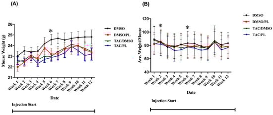 Food consumption and body weight were monitored during the period of chemotherapy injections. Overall, neither variable differed significantly as a result of the treatment group. Significant differences relative to control mice were observed, however, in treatment-by-week interactions for body weights of mice treated with PL in week 6 F [7.101,78.11] = 2.201, p < 0.05) (Figure 1A); Bonferroni’s multiple comparison revealed TAC/PL treatment significantly decreased body weight 6 weeks post-treatment compared to DMSO alone. For food consumption, there were significant differences between treatment-by-week interaction F [1.817,3.633] = 11.61, p < 0.05) (Figure 1B); Bonferroni’s multiple comparison revealed TAC/PL significantly decrease food consumption week 2 and TAC/DMSO week 6 compared to DMSO only.