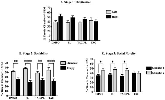 Sociability. (A) No significant difference in chamber exploration time in all groups. (B) Ordinary social behavior in all treatment groups by spending significant time in a chamber with the novel mouse (stimulus 1). (C) Animals treated with DMSO, PL, and TAC/PL distinguished the previously present mouse (stimulus 1) from the newly presented mouse (stimulus 2). Only the TAC-treated animals failed to distinguish between the previously present mice (stimulus 1) and the newly introduced mice (stimulus 2). One-way ANOVA, average ± SEM; Holm-Sidak multiple comparisons * p < 0.05, ** p < 0.01, **** p < 0.0001. (n = 12).