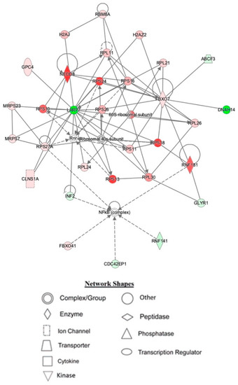Depiction of hippocampal network 1 identified by IPA being affected by TAC/PL co-treatment to TAC treatment. Node color is indicative of differential expression. Red represents upregulation, and green represents downregulation. Color intensity directly corresponds to the degree of regulation. Gray nodes represent proteins found in the data set but were not significantly expressed. Uncolored nodes represent proteins not differentially expressed but were incorporated into the computational network based on evidence stored in the Ingenuity Knowledge Base. The arrows and blocked lines indicate known direct and indirect interaction as well as the direction of the interaction.