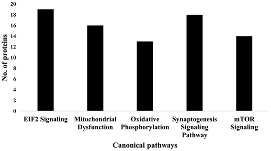 We used a bottom-up proteomics approach to examine how TAC treatment affects the hippocampus in female mice. The identified upregulated proteins included DBI, which has been shown to be upregulated in several human brain tumors [24]; cytochrome C, which plays an important role in apoptosis; and the NDFB3 complex, which is part of the mitochondrial membrane respiratory chain (Table 1). Mutations in the complex are associated with mitochondrial dysfunction and play key roles in neurodegenerative diseases [25]. In addition, NMT2 was downregulated. The NMT2 enzyme is crucial due to its role in co- or post-translation modification of several proteins that impact protein–protein interactions involved in several metabolic pathways [26]. The canonical pathways most affected by the chemotherapy regimen tested in our experiments included EIF2 signaling, oxidative phosphorylation, and mitochondrial dysfunction (Figure 4 & Table 4); all have been implicated in neurodegenerative diseases.