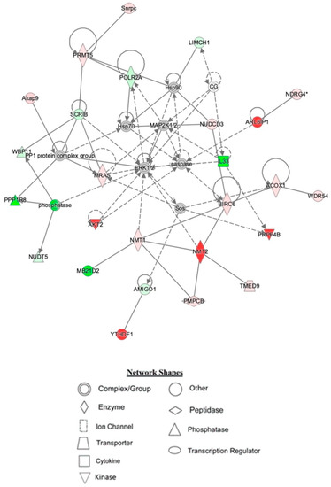 The top networks identified by IPA as affected by co-treatment with TAC and PL indicated functions such as post-translational modification, RNA post-transcriptional modification, and cellular development (Table 5). Network 1 mainly centers around ERK1/2 signaling (Figure 5), which regulates several cellular processes such as cell cycle, cell proliferation, cell differentiation, and apoptosis [36]. The pathways are evolutionarily conserved, and genetic and epigenetic mutations in molecules involved are implicated in several cancers, making them good therapeutic target candidates. For instance, doxorubicin is known to target cancer cells by inducing DNA damage through ERK activation [37]. In addition, PL reportedly elicits its anti-cancer effects by activating the MEK/ERK pathway [38].