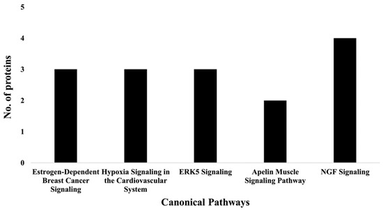 Proteomics was used to analyze the impact of co-treatment with PL and TAC (i.e., TAC/PL). The notable canonical pathways (Figure 6 & Table 6) included the NGF signaling pathway, which plays an important role in maintaining neuron populations in the nervous system by regulating cell death and survival. NGF belongs to a family of proteins known as neurotrophins, which are responsible for the development, survival, and function of neurons and have been associated with neurodegenerative disease states and symptoms [32]. Thus, the NGF signaling pathway may provide insight into the mechanisms underlying chemotherapy-induced cognitive impairment. Apelin muscle, ERK5, estrogen-dependent breast cancer, and hypoxia in the cardiovascular system signaling pathways were also affected (Figure 6 & Table 6). These pathways overlap in their abilities to affect several processes that include inflammation, cancer progression, cell survival, and neurodegeneration [33,34,35].