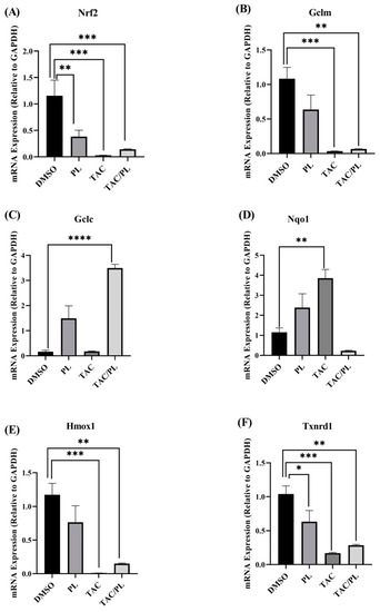 Changes in mRNA expression of Nrf2 cytoprotective target genes. (A) PL, TAC, and TAC/PL treatments reduced expression of Nrf2. (B) PL, TAC, and TAC/PL treatments reduced expression of GCLM. (C) TAC and TAC/PL treatments increased expression of GCLC. (D) TAC treatment increased expression of Nqo1. (E) TAC and TAC/PL treatments reduced expression of Hmox1. (F) PL, TAC, and TAC/PL treatments reduced expression of Txnrd1. One-way ANOVA, average ± SEM; Bonferroni multiple comparisons * p < 0.05, ** p < 0.01, *** p < 0.001, **** p < 0.0001. DMSO, n = 7; PL, n = 9; TAC, n = 8; TAC/PL, n = 6.