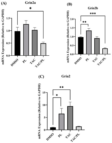 Changes in mRNA levels of genes encoding NMDA and AMPA receptor subunits (A) TAC/PL treatment reduced mRNA levels of Grin2a. (B) PL treatment increased and TAC/PL treatment reduced mRNA levels of Grin2b. (C) PL and TAC treatments increased mRNA levels of Gria2. One-way ANOVA, average ± SEM; Bonferroni multiple comparisons * p < 0.05, ** p < 0.01, *** p < 0.001. DMSO n = 7; PL n = 9; TAC n = 8; TAC/PL n = 6.