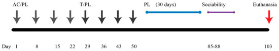 Chemotherapeutic agents (docetaxel, doxorubicin, cyclophosphamide; TAC) and 0.9% sodium chloride were received from the UAMS inpatient pharmacy. The chemotherapeutic agents were reconstituted with sterile saline; stock solutions were stored at 4 °C. PL (Sigma Aldrich) was dissolved in dimethylsulfoxide (DMSO; Fisher) and stored at 4 °C. Animals were divided into 4 treatment groups (n = 12 mice/group): Animals were divided into four groups, namely DMSO (control), PL, TAC, and TAC/PL. The TAC and TAC/PL groups each received 4 cycles of weekly doxorubicin (2 mg/kg) and cyclophosphamide (50 mg/kg), followed by 4 cycles of weekly docetaxel (8 mg/kg). The TAC/PL and PL groups received PL (2 mg/kg) weekly (12 weeks) up to 24 h prior to behavioral testing. The control group was injected weekly with 0.5% DMSO for the entire treatment period. All injections were administered intraperitoneally. Sociability behavior testing was conducted 30 days after the last docetaxel injection. Figure 9 shows the graphical representation of the experiment timeline.