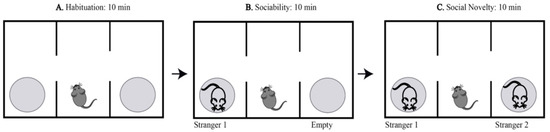 Mice were tested for social memory with an aluminum floor arena, transparent acrylic walls, and an open ceiling (Figure 10). The arena has three adjoining chambers (left, center, and right), each 40 cm × 20 cm × 23 cm in size; each chamber has an opening, connecting the center chamber to the other two. In addition, an aluminum cylindrical cage with plastic ends was placed in the left and the right chambers. The testing was conducted in three 10-min phases per subject. For the first phase (habituation phase), the subject was placed inside the arena in the center chamber and allowed to freely familiarize themselves with the arena (Figure 10A). During phase 2 (sociability phase), a new mouse (all mice are of the same sex, age, and strain) known as “stimulus 1” (stranger 1) was introduced into one of the cylindrical cages (Figure 10B). Finally, during phase 3 (social novelty phase), a second, newer mouse known as “stimulus 2” (stranger 2) was placed in the remaining cylindrical cage. Location bias for phases 2 and 3 was eliminated by randomly selecting left or right chamber per subject (Figure 10C). Mice serving as stimulus 1 and stimulus 2 were chosen randomly and nonconsecutively and were naïve non-aggressive animals that had no contact with testing subjects before the experiment. Animals were sacrificed by cervical dislocation 24 h after behavior testing.
