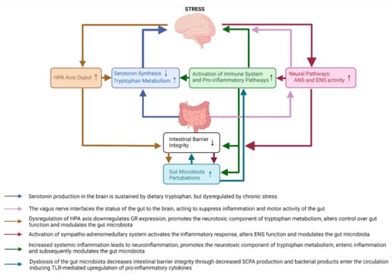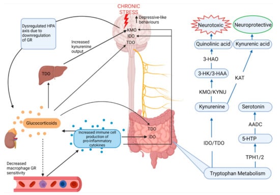 Serotonin is metabolized from tryptophan, an essential amino acid derived from ingested protein, which is utilized largely by enterochromaffin cells in the gut, but it is also absorbed into the circulation where it can cross the blood–brain barrier [,]. Therefore, since serotonin cannot cross the blood–brain barrier, its production in the brain relies on dietary tryptophan reaching the brain where tryptophan hydroxylase (TPH) converts tryptophan into 5-hydroxytryptophan (5-HTP) after which aromatic amino acid decarboxylase produces serotonin from 5-HTP []. Yet, 95% of tryptophan is converted separately along the kynurenine pathway in peripheral organs, but especially the gut, which exerts a major influence on serotonin synthesis through the modulation of tryptophan availability, in both the CNS and ENS, the rate of which is under control of indolamine-2,3-dioxygenase (IDO1), which is influenced by inflammatory cytokines (Figure 4) [,]. Chronic stress is known to activate the immune system and pro-inflammatory pathways through dysregulation of the negative feedback of the HPA axis by decreasing glucocorticoid receptor expression [,]. Under basal conditions, the glucocorticoid-glucocorticoid receptor complex on target immune cells such as macrophages inhibits the transcription factor NF-κB, preventing the expression of proinflammatory cytokines such as IL-1β []. Thus, chronic stress drives systemic production of pro-inflammatory cytokines through dysregulation of glucocorticoid receptor sensitivity, and this increase in pro-inflammatory cytokines leads to increased IDO activity. Furthermore, elevated glucocorticoid levels brought about by chronic stress also activate tryptophan-2,3-dioxygenase (TDO) which also promotes the kynurenine pathway of tryptophan metabolism []. TDO is largely confined to the liver, but is also expressed in the brain and the gut, making stress and inflammatory pathways highly relevant to the regulation of the kynurenine pathway and serotonin synthesis [].