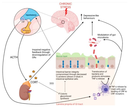 The contributions of the hypothalamic–pituitary–adrenal (HPA) axis to gut pathology and behaviour in response to chronic stress. Exposure to stress stimulates corticotropin releasing factor (CRF) release from the hypothalamus, which induces pituitary release of adrenocorticotropic hormone (ACTH) []. ACTH stimulates the release of corticosterone (CORT) from the adrenal cortex []. Chronic stress downregulates hippocampal glucocorticoid receptors (GRs), which bind CORT regulating negative feedback of the HPA axis under normal conditions []. Chronic stress thus leads to chronically elevated CORT levels, which are known to lead to depressive-like behaviours. Under chronic stress, CRF production by the hypothalamus may also reach the circulation where CRF may travel to the gut and bind CRF receptors on mast cells, inducing intestinal inflammation and compromising intestinal barrier integrity [,]. Some evidence indicates that colonic glucocorticoids may contribute to the maintenance of intestinal barrier integrity and that colonic glucocorticoid synthesis occurs through separate mechanisms to adrenal-derived glucocorticoids []. Adrenal-derived glucocorticoids may also inhibit colonic glucocorticoid synthesis, thus corroborating findings of impaired intestinal barrier integrity existing with a dysregulated HPA axis []. GI tract—gastrointestinal tract; TJ—tight junction proteins.