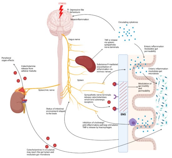 The brain-to-gut effects of activation of the autonomic nervous system in response to chronic stress. Exposure to stress activates the sympatho–adrenomedullary system which results in the release of catecholamines from the adrenal medulla via activation of the splanchnic nerve []. Catecholamines released by the adrenal medulla exert various effects on different peripheral organs, however they may also travel via the circulation to the gut where they may diffuse into the lumen and modulate the gut microbiota []. Exposure to stress also exerts effects over the enteric nervous system (ENS), by driving activation of sympathetic nerve terminals which release catecholamines that bind adrenergic receptors in the ENS, thus modulating intestinal motility and permeability []. Chronic stress also inhibits the vagus nerve. This results in increased splenic TNF-α release, exacerbated by Substance-P-driven responses by intrinsic nerves of the ENS []. Inhibition of the vagus nerve by chronic stress also inhibits the cholinergic anti-inflammatory pathway, stimulating TNF-α release by macrophages in the gut []. This increase in pro-inflammatory cytokines may lead to intestinal inflammation, compromising intestinal barrier integrity, but may also modulate the gut microbiota [,].