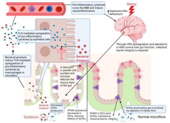 Regulation of the intestinal barrier by chronic stress. Chronic exposure to stress results in dysregulation of the HPA axis and ANS control over gut function [,]. As a result, Paneth cell number and function is reduced, contributing to microbial dysbiosis through a reduction in the mucus layer of the gut [,]. This reduction of the mucus layer also allows bacteria and their associated products to reach the gut epithelium []. Since dysregulation of the HPA axis results in a decrease in tight junction proteins, bacterial products such as LPS can reach epithelium, the lamina propria and circulation where a TLR-mediated pro-inflammatory response is initiated by macrophages []. These pro-inflammatory cytokines ultimately travel to the brain where they can cross the blood–brain barrier and increase neuroinflammation, eliciting depressive-like behaviours [,]. HPA—hypothalamic–pituitary–adrenal axis; ANS—autonomic nervous system; SCFA—short chain fatty acids; FFAR2—free fatty acid receptor 2; EEC—enteroendocrine cell; TLR—Toll-like receptor; BBB—blood–brain barrier.