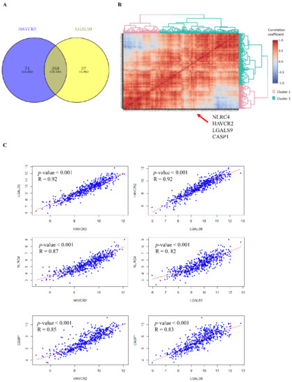 NLRC4 and CASP1 expression is highly positively correlated with those of Tim-3 and Gal-9. (A) There were 358 genes positively correlated with Tim-3 and Gal-9. (B) Correlation coefficient hierarchical clustering showing that NLRC4 inflammasome molecules are positively correlated with Tim-3 and Gal-9. (C) Pairwise dotplot of Tim-3, Gal-9, NLRC4, and CASP1. HAVCR2: Tim-3; LGALS9: Gal-9.