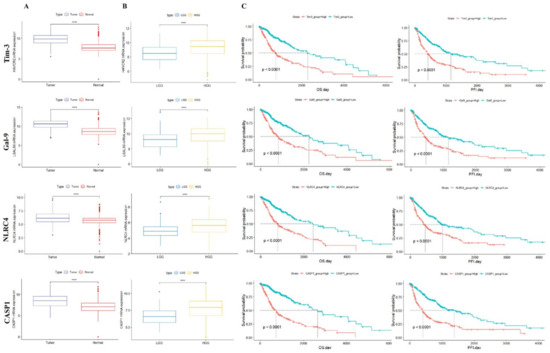 Survival analysis of Tim-3, Gal-9, NLRC4, and CASP1. (A) Comparison between tumor and normal tissue in terms of Tim-3, Gal-9, NLRC4, and CASP1 expression. (B) Comparison of gene expression levels in low-grade glioma (LGG) and high-grade glioma (HGG). (C) Survival analysis of high-expression and low-expression genes. OS: overall survival. PFI: progression-free interval.