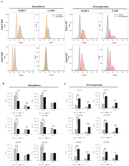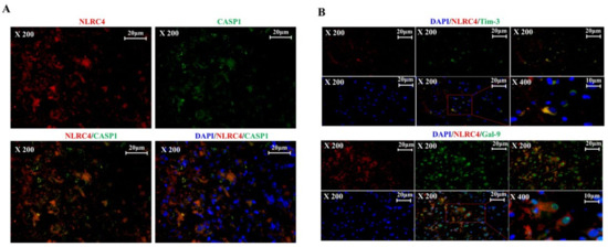 We previously confirmed through in silico analysis that Tim-3 and Gal-9 are significantly correlated with the NLRC4 inflammasome. Both co-expressed with NLRC4 protein in glioma tissues (Figure 3B). Gal-9 expression occurred on both the cell surface and the nucleus. Gal-9 was translocated into the nucleus [29] (Supplementary Figure S4A,B).
