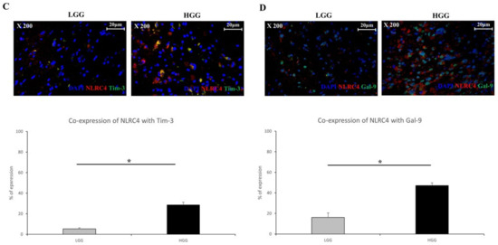 Tim-3/Gal-9 and NLRC4 inflammasome expression in glioma. (A,B) Human glioma specimens were analyzed by immunohistochemistry (IHC) to detect NLRC4 (red), caspase-1 (green), or Tim-3 (green). (C,D) NLRC4 co-expression with Tim-3 or Gal-9 for each grade (LGG: low-grade glioma; Grade 2/HGG: high-grade glioma; Grade 3 + Grade 4) was evaluated by IF and quantitated by ImageJ (National Institutes of Health, Bethesda, MD, USA). * p < 0.05; paired t-test.