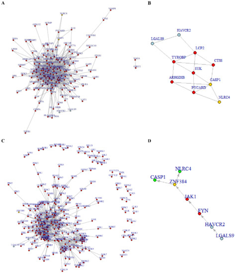 A protein–protein interaction (PPI) analysis was conducted to localize physical connections between the Tim-3-Gal-9 axis and the NLRC4 inflammasomes. The PPI score was derived from the String database (https://string-db.org/, accessed on 21 November 2021). Its confidence score was ≤0.4 without text mining. A kinase-transcription factor (TF) axis analysis was conducted based on the PPI confidence score.