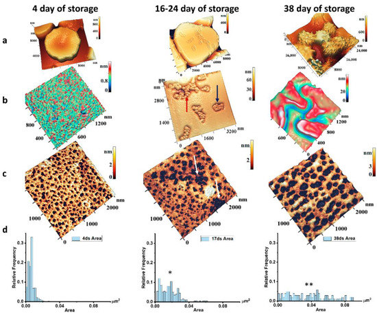 If in the initial period the cytoskeleton pores had areas of 0.01 μm2, then on 16–24 days of storage, this value increased by more than 2.5 times, the variance increased, and the maximum values reached 0.06 μm2. Cytoskeleton network structure became heterogeneous, conglomerates of large pores appeared. Subsequently, the pores merged, and the cytoskeleton network became as shown in Figure 3c (38 days of storage). Thus, the area variance increased even more, and the maximum pore areas reached values of 0.09 μm2 (Figure 3c,d, 38 days of storage).
