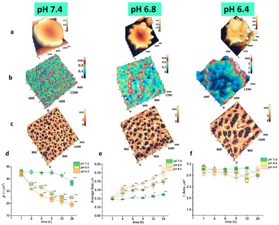 The control values were taken as pH = 7.4, normal physiological conditions. Decreased pH values indicated medium acidification and, therefore, the presence of RBCs in the oxidative stress during the incubation time of 24 h. In the control, there were 78% of discocytes. Along with the decrease in pH, it transformed into pathological forms, echinocytes at pH = 6.8 (65%) and spheroechinocytes at pH = 6.4, (56%) (Figure 4a). The presence of RBCs in solution with pH = 6.8 during 24 h was characterized by the appearance of topological defects in the membrane nanostructure and individual large cytoskeleton pores, which grew and merged (Figure 4b,c). Their average sizes reached 160 nm or more. At pH = 6.4, the topological defects of membrane nanostructure became total, and all cytoskeleton network structures consisted of large pores with sizes up to 200–300 nm (Figure 4b,c). Transformation of the cytoskeleton network developed as the incubation time increased. At pH = 7.4, the pore number (≈45 per μm2) and their average size (0.12 μm) practically did not change during 24 h. pH = 6.8, and moreover 6.4 caused a sharp change in parameters: the pore number decreased to 25 and 20, and their size increased to 0.18 and 0.20 μm, respectively, during 24 h (Figure 4d,e). It is important to note that the sum of pore areas on the same fragments (3 μm2) during cytoskeleton network transformation remained the same during the entire incubation time (Figure 4f). This meant that the mass of protein filaments stayed the same and only redistributed between cytoskeleton structures.