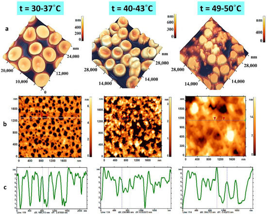 Changes in morphology and cytoskeleton structure at different temperatures of RBC suspension in buffer solution. Horizontally: (a) AFM images of RBC morphology; (b) transformations of cytoskeleton network in 2D image; (c) their profiles at buffer solution temperatures 30–37, 40–43, and 49–50 °C. Incubation time was 60 min. Size scales and color scales of heights are indicated for AFM images. The red triangles show size of a single pore.