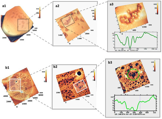 Defects of RBC membranes under the influence of UV radiation. (a1–a3) Defects on RBC surface and their fragments. (b1–b3) Cytoskeleton network and its individual fragments. Irradiation time was 60 min. Size scales and color scales of heights are indicated for AFM images.