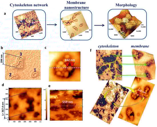 The development of membrane surface nanodefects was similar to the dynamics of large cytoskeleton pores. These relationships are shown in Figure 7f. On the left, there are pores in the cytoskeleton network; on the right, there is their appearance on the membrane nanosurface. Obviously, the connections shown in Figure 7f are not dominant manifestations of the connections between cytoskeletal pores and grain domains on the membrane surface. Such an accurate experimental reproduction of a given cytoskeleton pore for an exactly given nanodefect of the membrane surface is practically impossible with instrumental methods. For this reason, statistical approaches are used for the comparison. The sizes and configurations of large cytoskeleton pores formed as a result of the factors shown in this work are close to the parameters of the domains on the nanosurfaces of RBC membranes (Figure 7b–e). Thus, the size of a large cytoskeleton pore (Figure 7e) was 559 nm, similar to the size of a domain formed from a group of grains (Figure 7c). The configuration and size of the pores in Figure 7b,c are close to each other.