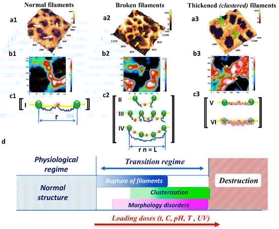 The cytoskeleton network consists of an ensemble of filaments [32]. AFM images show that each one can exist as a single thin filament (Figure 8(a1–c1)), as a broken filament (Figure 8(a2–c2)), and as a thickened clustered filament (Figure 8(a3–c3)). The thickness of a single filament (network septum) consisting of individual protein granules was 35–50 nm (Figure 8(b1)). In all experiments, two subsequent phenomena were recorded with a loading dose increase–hemin concentration, time of pRBCs storage, decrease in pH value, increase in suspension temperature and increase in UV irradiation dose. It was observed, first, filament network rupture (Figure 8(a2,b2)) and pore enlargement, and then the clustering and thickening of filaments (Figure 8(a3,b3)). Clustered thickened filaments consisted of grouped layers of individual granules and were on average 200–300 nm thick. These processes were common to all types of the indicated exposures and had similar patterns. They were ultimately caused by oxidative stress and precisely by ROS [33].