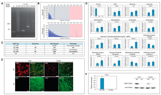 Generation of Fragile X (FX) human embryonic stem cell (hESC) isogenic clones: (A) Analysis of the FX-hESC isogenic clones’ CGG repeat size by PCR-based repeat-number assay of hESC. H9 (WiCell, University of Wisconsin) served as control; (B) AmplideX PCR/CE FMR1 Reagents (Asuragen) commonly used for clinical diagnosis of FXS; (C) FX mutation status of isogenic iN clones; (D) neuronal characterization of iNs. Expression of neuronal genes in FX- and control-iNs. Quantitative RT-PCR analysis was performed on RNA extracted at 39 days in vitro (DIV). The housekeeping gene GUSB served as an internal control. Three independent experiments were performed, and data are represented as mean ± SEM. T-test: * p < 0.05 (E) FMRP expression in FX and isogenic control hESC 7 & 32 DIV. β-III tubulin (Tuj1; green) and FMRP (red). Scale bar: 200 µm; (F) RNA expression of FMR1 analyzed by qRT-PCR at 39 DIV (left). Data are represented as mean ± SEM. Three independent experiments were performed. T-test: *** p < 0.001. FMRP expression using western blot analysis (right). Protein was extracted at either day 7 or at 32 DIV. Human FMRP antibody is shown, and actin served as a positive control.