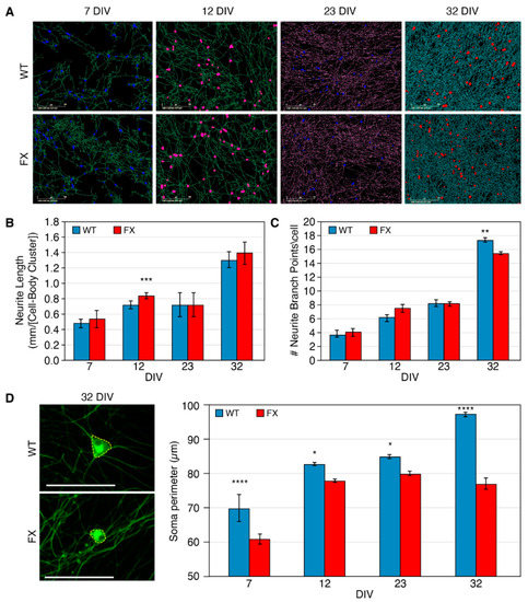 High-throughput image analysis of Fragile X (FX) induced neurons (iNs): (A) Representative images of WT and FX-iNs following Incucyte live-cell analysis, at four time points following neuronal induction (7, 12, 23, 32 DIV). Soma and neurites are presented in different colors. Scale bar: 200 µm; (B) total neurite length in mm/cell body cluster; (C) neurite branch points/cell body cluster. Two–three independent experiments were performed including 2500–4000 neurons at each time point. Data are represented as mean ± SEM. One-way ANOVA: ** p < 0.005, *** p < 0.0005; (D) representative images of iNs’ soma perimeter labeled with Tuj1 (green), at 32 DIV. Scale bar: 50 µm (left). Quantification of soma perimeter (µm) was analyzed by the cellSens Dimension software (right). Two (23 & 32 DIV) or three (7 & 12 DIV) independent experiments were performed on each day for both neurite length and neurite branch points including 2000–4000 neurons at each time point. Data are represented as mean ± SEM. One-way ANOVA: * p < 0.01, **** p < 0.0001.