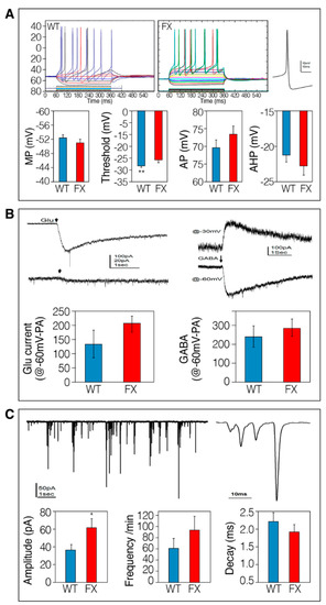 Patch-clamp recordings of Fragile X (FX)-compared to control-induced neurons (iNs): (A) Top: Intrinsic properties of action potentials (APs) of FX-iNs compared to WT. Sample illustration of an IV curve, depicting changes in membrane voltage in response to hyperpolarizing and depolarizing current pulses. The right is an expanded AP taken from the battery on the left. Bottom: summary of recorded neuron properties: resting membrane potential (MP); firing threshold (** p < 0.01); AP amplitude; after-hyperpolarization (AHP). WT: n = 30, and FX-iNs: n = 20; (B) iNs Glutamate and GABA responses. Responses to pressure application of glutamate onto FX-iNs at resting membrane potential (−60 mV) in voltage-clamp (left). Bottom: comparison of FX vs. WT-iNs’ response to glutamate at >40 DIV (WT, n = 15; FX-iNs, n = 10). Right: responses to GABA at resting potential (−60 mV) and at a depolarizing potential (−30 mV). Bottom: Comparison of FX vs. WT-iNs’ response to GABA at >40 DIV (WT, n = 7; FX-iNs, n = 8); (C) top: Spontaneous excitatory synaptic currents in FX-iNs compared to WT. Sample illustration of a trace recorded from FX neurons shown at low (left) and high (right) resolutions. Bottom: Comparison of the mean amplitude (size in pA) of synaptic current produced by FX- and control-iNs; p < 0.02. Frequency of spontaneous EPSC in FX- and control-neurons. The decay time of individual EPSCs. Comparisons were made between voltage-clamped (n = 33) WT neurons and FX-iNs (n = 21), held at −60 mV.
