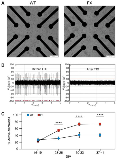 MEA is a complementary approach to patch-clamp and is a gold standard for characterizing the extracellular potential of neurons and assessing the neuronal network activity in vitro. We used high-throughput MEAs which were recorded in 24-well-plates (12 electrodes/well) to compare the neural network activity of FX and WT neurons plated at the same density (105 neurons/well) and conditions (Figure 4A; for details, see in Methods: MEA recordings and data analysis). Blockage of APs by Tetrodotoxin (TTX; 0.5 µM) indicates that APs in both FXS and WT neurons results from the activation of Na+ currents (Figure 4B). Neurons were recorded at eight different time points during differentiation (16–44 DIV), and spontaneous APs were detected using a voltage-threshold-based algorithm (Figure 4C). Approximately 60% of electrodes were active in both lines, indicating sustained network activity in both FX and WT neurons. The increase in the number of active electrodes with age in culture may represent neuronal maturation within the duration of the experiment, reaching an optimal activity of >65% of all electrodes on >30 DIV. Electrode recording from FX neurons showed a nearly two-fold higher activity (73%) compared to WT (42%) (>23 DIV; p < 0.0001), and the results were confirmed with the high number of recorded neurons (Figure 4C).