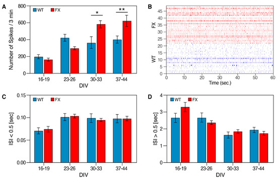 For further analysis, we included only electrodes that discharged ≥15 spikes/minute. Collectively, the FX-iNs were hyperexcitable compared to the control as seen by the significantly higher number of spikes per active electrode in FX neurons (at 30–44 DIV; Figure 5A,B). Inter-spike interval (ISI) analysis demonstrated no differences in ISI between the two lines (Figure 5C,D), probably due to the variable spike frequencies in different neurons constructing both FX and WT neuronal networks.