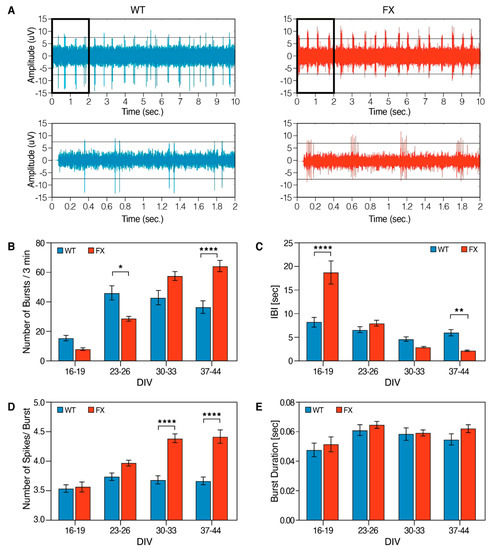 Higher spontaneous burst activity in FX neurons: (A) representatives burst traces of WT (blue) and FX (red) at 37 DIV during 10 s recording (top) and higher resolution of the first 2 s from each trace (bottom); (B) number of bursts; (C) intra-burst interval (IBI); (D) number of spikes in a burst; (E) burst duration. Bursts were defined as >3 spikes with <300 ms inter-spike interval. Three independent experiments were performed at each time point (16–19, 23–26, 30–33 and 37–44 DIV). n = 50–235 electrodes were sampled for each line in each time point. Data are represented as mean ± SEM. One-way ANOVA: * p < 0.05, ** p < 0.01, **** p < 0.0001.