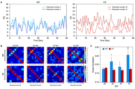 Synchrony of neuronal network activity: (A) Representative synchronous (WT, left) and asynchronous (FX, right) electrical activity between two electrodes, (AU—arbitrary unit). The signals shown are spike locations that have been convoluted with Gaussian (sigma = 0.5); (B) heat maps summarizing cross-correlation (CC) among all active electrodes (≥15 spikes/min). The panel ranges from high synchrony/high CC among neurons (red), to low synchrony/ low CC (blue). Diagonal red patterns represent autocorrelation within the recorded neurons; (C) averaged values of CC electrodes. The threshold was determined to be >0.1. The same batch of neurons was recorded for all time points. Two independent experiments were performed at each time point (23, 30,37 and 44 DIV). A total of 35–207 pairs of electrodes were analyzed for each line in each time point. Data are represented as mean ± SD. T-test: * p < 0.05; ** p < 0.005.