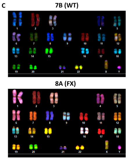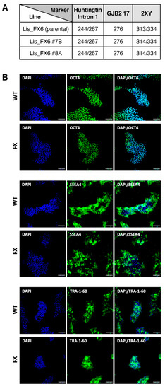 Characterization of hESC subclones generated from Lis_FX6: (A) Polymorphic marker analyses of CA repeats (marker), known to identify each unique hESC line, are listed. Lis_FX6 original hESC line; #—subclone derived from the original hESC line; (B) expression of the OCT4/ SSEA4/ TRA-160 pluripotent genes (green) in the two isogenic clones. Nuclear staining: DAPI (blue). Scale bar: 100 µm; (C) karyotype by SKY analysis of clone 7B at passage 48 and clone 8A at passage 46.