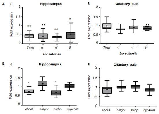 Modification of gene expression in astroglial Lsr cKO mice. (A) Verification of Lsr gene excision in astroglial cells using RT-qPCR. Box plot presentation of fold expression of total Lsr and different Lsr subunits α, α’, and β in 13-month-old cKO mice (n = 5) with respect to WT mice (n = 5) in the hippocampus (a) and olfactory bulb (b). (B) Box plot presentation of fold expression of cholesterol-related gene expression in 13-month-old cKO mice (n = 5) with respect to WT mice (n = 5) in the hippocampus (a) and olfactory bulb (b). Abbreviations: abca1, ATP-binding cassette transporter 1; hmgcr, HMG CoA reductase; srebp1, sterol regulatory element-binding transcription factor 1; cyp46a1, cytochrome P450 family 46 subfamily A member 1. Statistical significance between WT and cKO mice is shown as: * p ≤ 0.05, ** p ≤ 0.01.