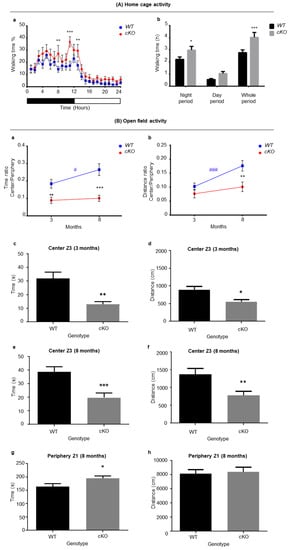 Behavioral analysis revealed several specific traits in cKO mice compared to WT animals. In addition, a series of traits were also correlated to aging in the cKO mice (Supplementary Table S1). In their environment, cKO mice remained active for longer periods of time compared to WT mice during the nocturnal period (Figure 2Aa), particularly at the beginning and at the end of the nocturnal period. This has also been observed in AD mice models, in which mice were found to be hyperactive during the nocturnal phase [,,]. In a novel environment, cKO mice tended to stay in the peripheral zone for longer periods of time when compared to WT mice, which can be a sign of thigmotaxis. Nevertheless, they traveled the same distance at the periphery, which indicates longer immobile periods at the periphery. Together, the observed immobility and thigmotaxis could reflect a form of anxiety. However, the results of the free exploratory paradigm excluded anxiety behavior in cKO mice. Instead, cKO mice exhibited signs of apathy. Interestingly, apathy is also considered to be an early marker for neurodegenerative diseases. In addition, patients with mild cognitive impairment (MCI) exhibiting apathy are at a greater risk of developing AD compared to those with no neuropsychiatric symptoms [].