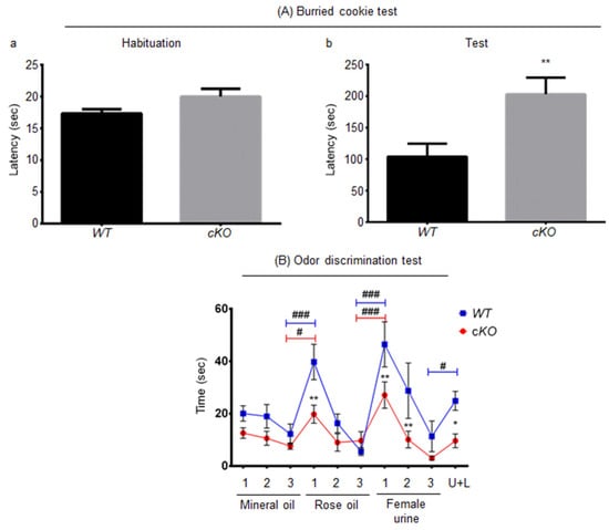 Olfactory assessment in cKO mice. (A) Buried cookie test results for WT (n = 20) and cKO (n = 18) mice. (a) Time taken to take and eat the visible cookie in habituation phase. (b) Time taken to find buried cookie. (B) Habituation/cross-habituation test results for WT (n = 10) and cKO (n = 10) mice. This test consists of a 5 min habituation step to the tea ball (no odor), then three 1 min habituation sessions to mineral oil, followed by three 2 min habituation sessions to rose oil, and by three 2 min habituation sessions to female urine. The test then ended with a 2 min odor discrimination step to female urine containing 1% lemon oil (U + L). Statistical significance when comparing a single point between cKO vs. WT mice is represented as: * p ≤ 0.05, ** p ≤ 0.01. Statistical significance when comparing different sessions for same genotype are indicated as: # p ≤ 0.05, ### p ≤ 0.001.