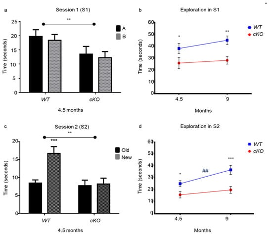 During the first session (S1) of the object recognition test, 4.5-month-old cKO and WT mice spent almost the same time exploring objects A and B, which are sets of similar objects (WT mice: 19.72 ± 2.36 s and 18.35 ± 2.04 s for the objects A and B, respectively; cKO mice: 13.51 ± 2.70 s for object A and 12.25 ± 2.14 s for object B) (Figure 4a). However, there was a clear genotype effect, since cKO mice spent less total time exploring than WT mice during the first session (Figure 4b, p = 0.03). Nevertheless, the object effect was insignificant for both cKO and WT mice, with no genotype–object interaction, indicating that cKO mice had no visual problems in localizing the object, but showed less interest than WT mice to this inanimate stimulus. At both 4.5 (38.08 ± 4.22 s for WT mice and 25.76 ± 4.69 s for cKO mice, p = 0.03) and 9 months of age (44.98 ± 3.60 s for WT mice and 28.07 ± 3.15 s for cKO mice, p = 0.003), there was a clear genotype effect (p = 0.001), but no age effect and no genotype–age interaction (Figure 4b), suggesting that the behavioral profile observed was age-independent.