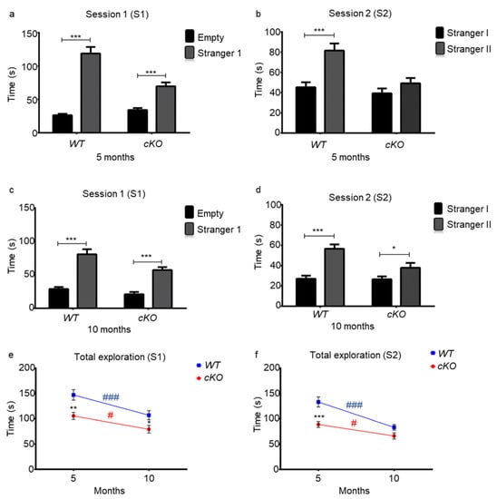 Sociability and social novelty assessment of WT (n = 20) and cKO (n = 18) mice. 5- (a,b) and 10- (c,d) month-old mice. (a,c) Session 1 (S1): exploration time (s) of stranger 1 vs. empty cup. (b,e) Session 2: exploration time (s) of stranger 1 used in S1 and a novel stranger. (e) Total exploration time in S1, in seconds, at 5 and 10 months of age. (f) Total exploration time (s) in S2 at 5 and 10 months of age. Statistical significance between cKO and WT mice at a certain time point is represented as: * p ≤ 0.05, ** p ≤ 0.01, *** p ≤ 0.001. Statistical significance with age in cKO and WT mice is represented as: # p ≤ 0.05, ### p ≤ 0.001.